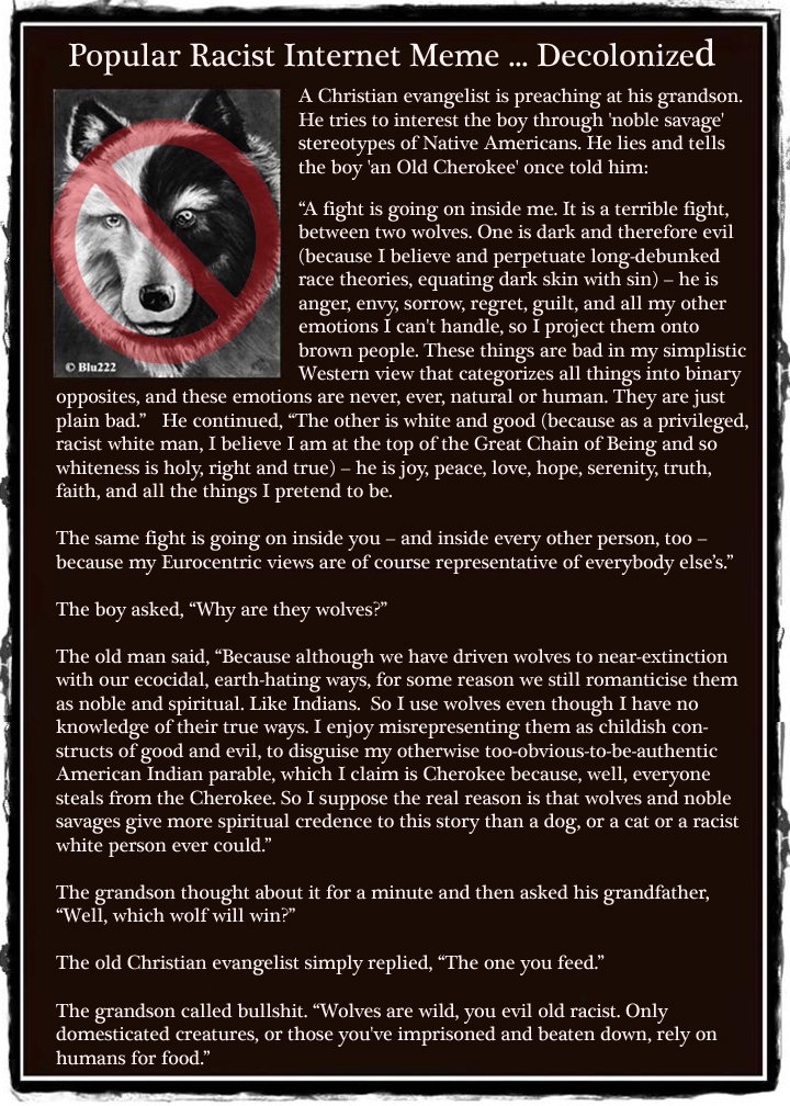 Well, I’m a little late to this table but feel compelled to share how this story was passed down to me by my step-father, who was white and of catholic dissent. While he seemed to believe in the core catholic principles of a God, he taught me as a child to respect Mother Earth and always pointed out the history of land occupation in various areas we lived. He seemed to hold respect for Indigenous peoples and would tell me “The tale of two wolves” when I would ask questions like “why are some people mean/murderers/etc” as a child. Long story short he died in 2015 due to complications brought on by alcoholism, and the last 3 years of his life were filled with a lot of mental agony and struggle which I witnessed first hand. When he died the thought of 2 wolves being inside of him and him feeding the dark wolf (he was very violent and not accepting of help being offered) rang in my head night after night which compelled me to get a FUCKING TATOO depicting this “tale”, which I clearly went full ignoramus on and only bothered looking at the first page of Google answers which are filled with various word/image combos, nothing on the history! I’m normally someone who at least wikipedia fact checks things, but I believed this story and connection to my step-dad for my whole life which clearly trumped by abilities to think critically.